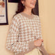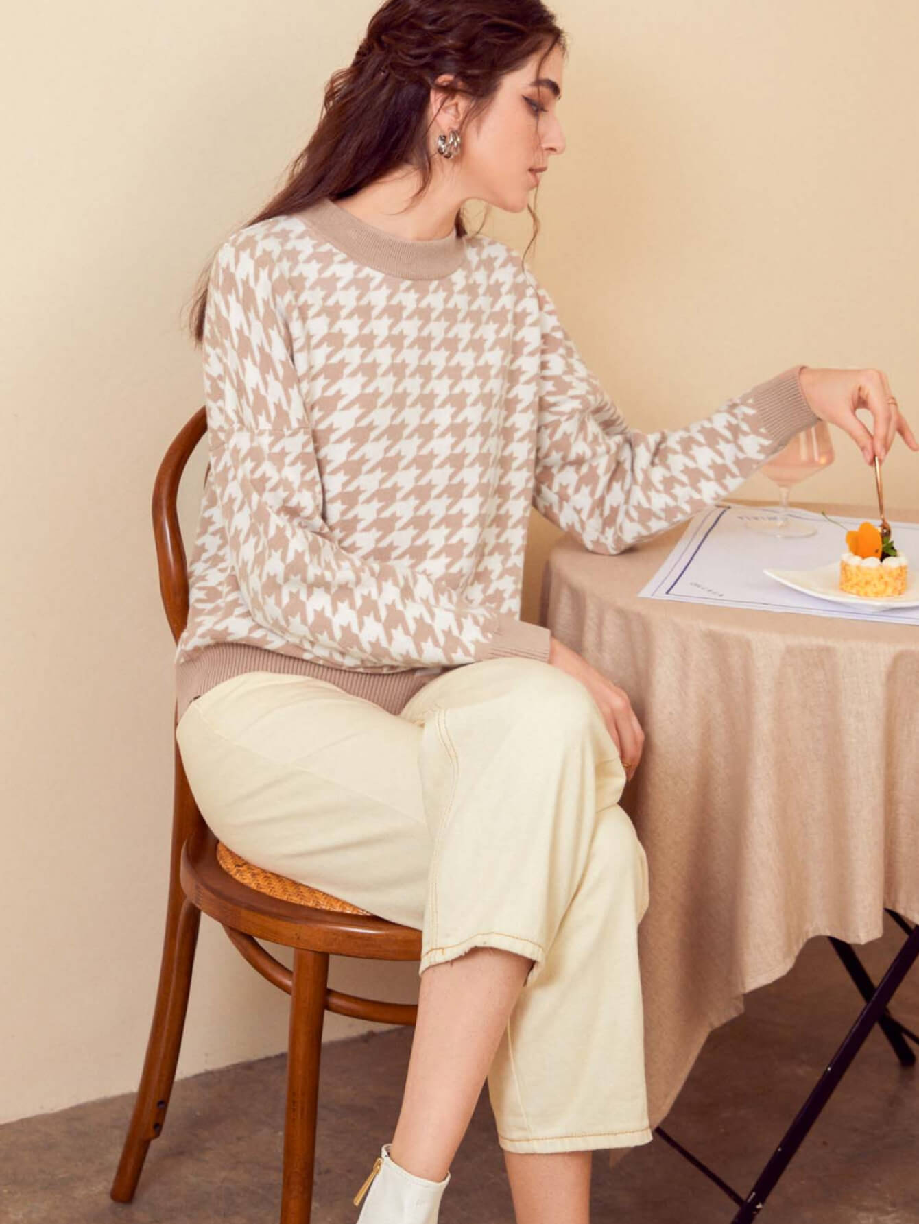 Houndstooth Geribbelde Trim Sweater | Lange Mouwen | Casual Trui met Verlaagde Schouders