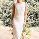 Introductie van een dromerige midi-jurk met hoge halslijn, voorzien van een diepe V-halslijn voor een extra vleugje glamour. Het ruchdetail in het lijfje en de geplooide naad dragen bij aan de aantrekkingskracht, terwijl een split in het midden van de rug het een edgy uitstraling geeft.