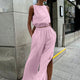 De Ivanna Linnen Zomer Set combineert een mouwloze crop top met een hoge taille lange broek met zijsplitten. Deze lichte linnen set biedt een luchtige, comfortabele en gedurfde look, perfect voor warme dagen. Ideaal voor moeiteloze, moderne elegantie en stijlvolle zomerse outfits.
