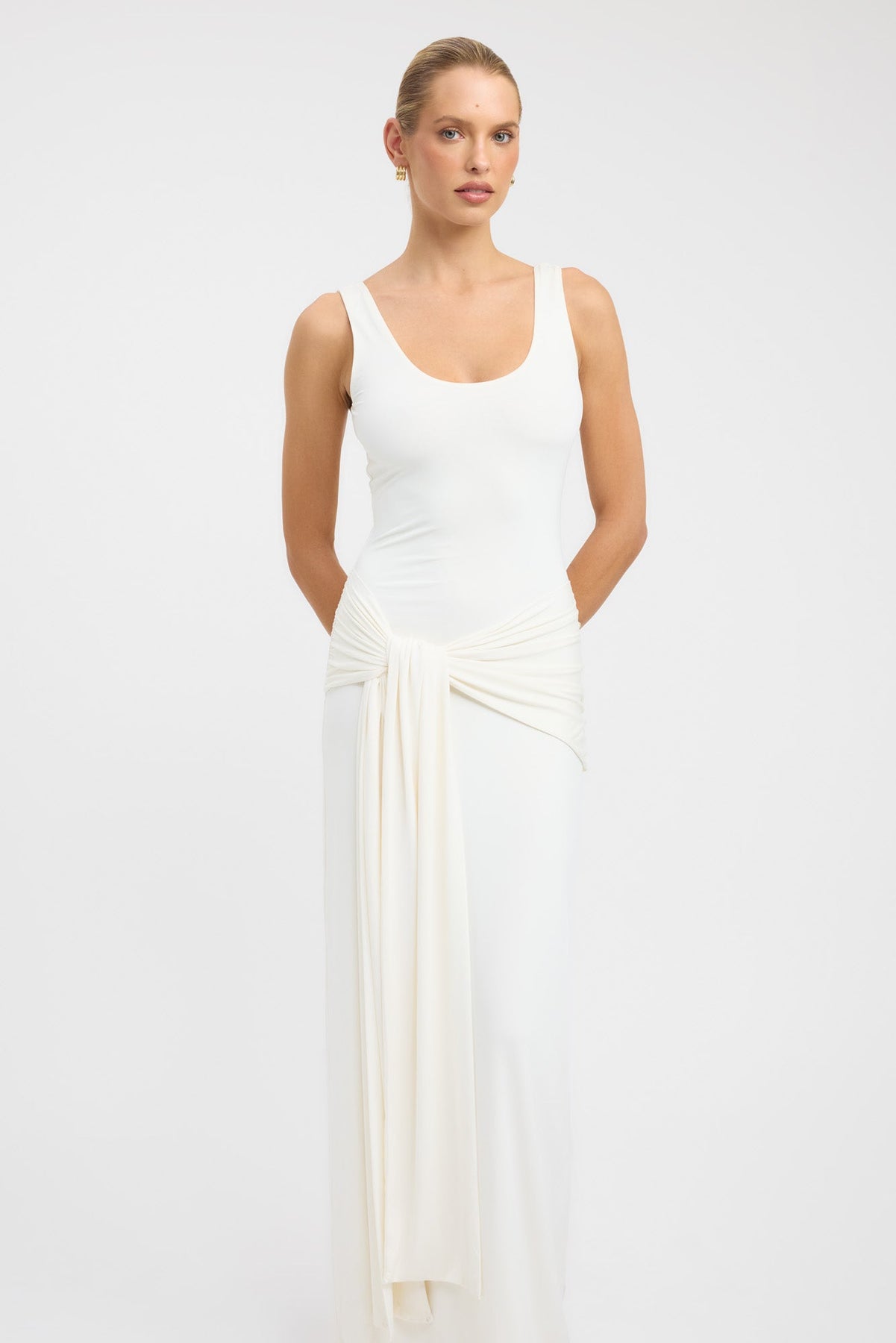De Shara Maxi Jurk in Tofu combineert een ronde hals, mouwloos ontwerp en een flatterende tailleband voor een vloeiend, elegant silhouet. Gemaakt van zachte stretch Light Jersey, biedt deze jurk comfort en verfijning. Perfect voor zowel casual avonden als speciale gelegenheden.