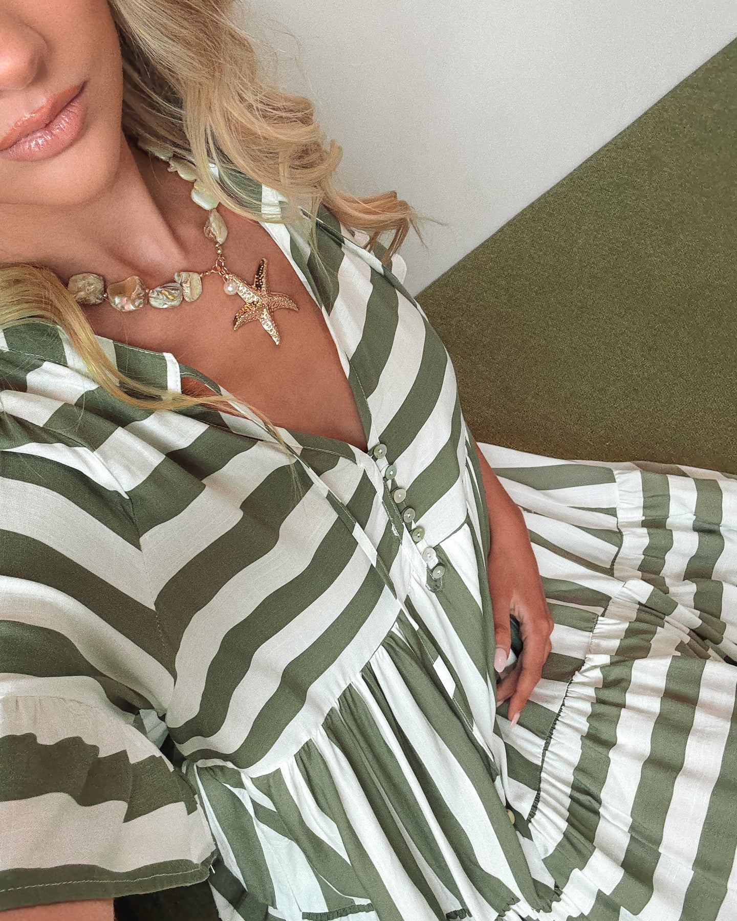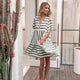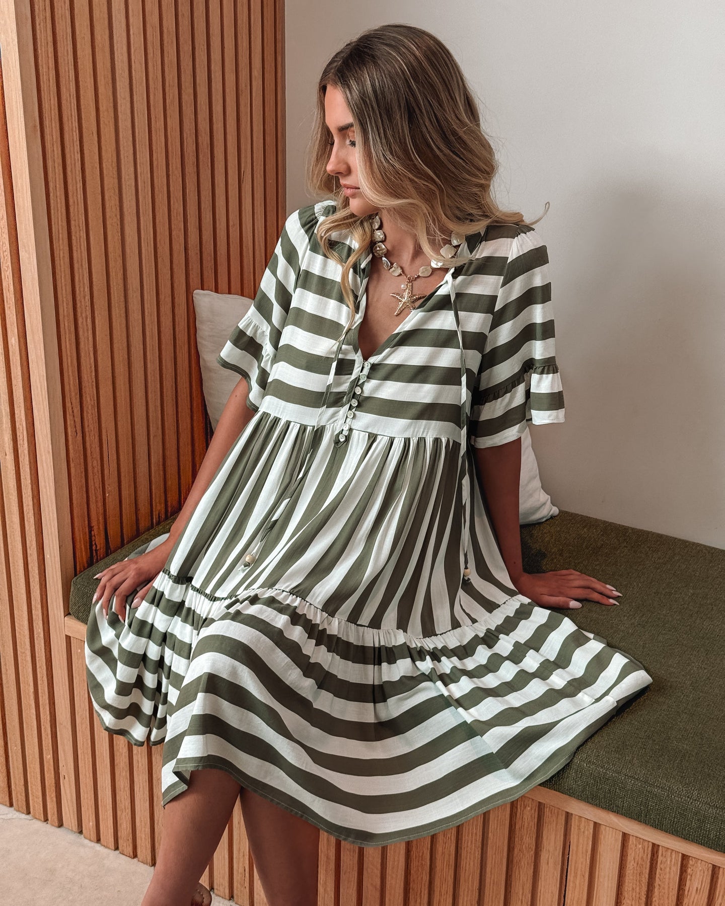 Vrouw | Jurk | Strik Halslijn | Knoopsluiting | Flodder Mouwen | Gelaagde Rok | Knie Lengte | Streep