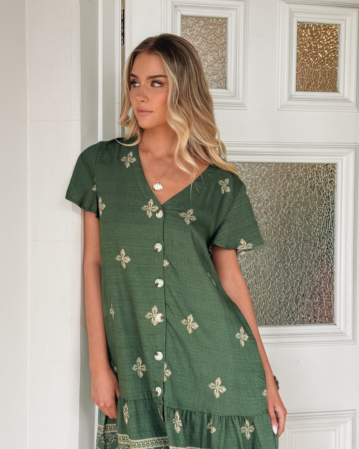 Deze comfortabele en stijlvolle jurk is perfect voor weekenduitstapjes of casual dagen. De v-hals en korte mouwen geven een luchtige, vrouwelijke uitstraling, terwijl de praktische zijzak een handig detail toevoegt. De lengte tot de knie zorgt voor een veelzijdige pasvorm die zowel casual als chic gedragen kan worden. Combineer met een hoed en espadrilles voor een moeiteloze weekendlook.