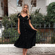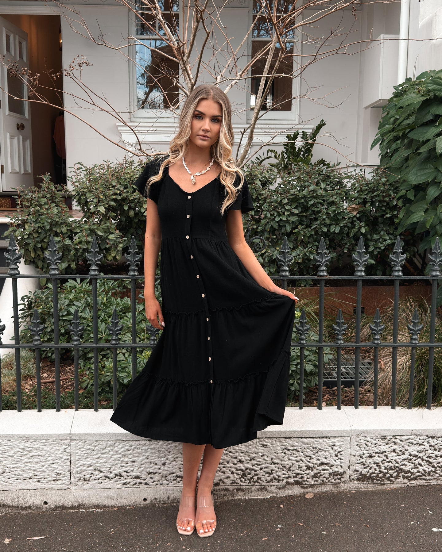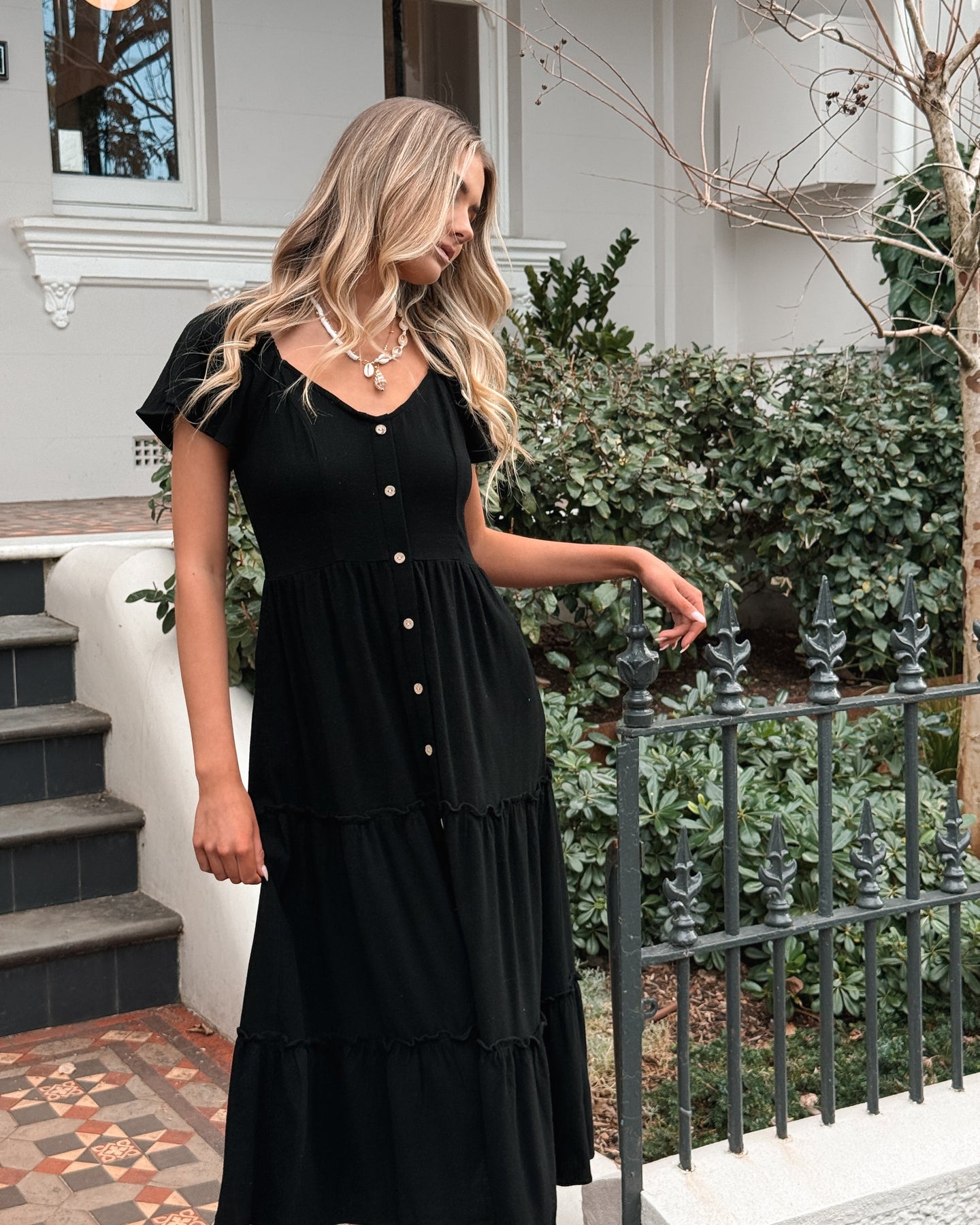 Deze zwarte midi-jurk is een luchtig en ontspannen zomers basisstuk. De zachte V-halslijn en elastische schouders zorgen voor comfort, terwijl de ruches op de rok een subtiel speels detail toevoegen. De niet-functionele knopen aan de voorkant en de zichtbare zijrits maken het silhouet compleet. Combineer met tan sandalen en een zonnenhoed voor een moeiteloze zomerlook.